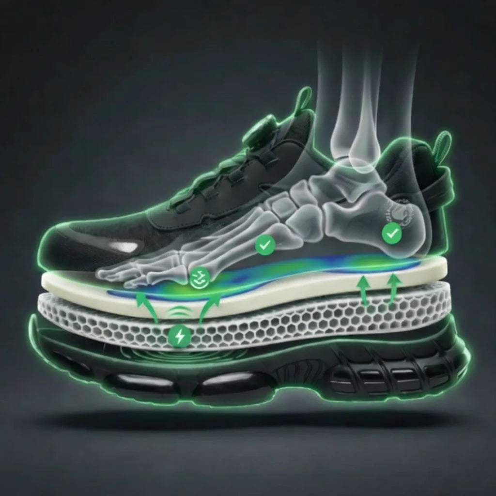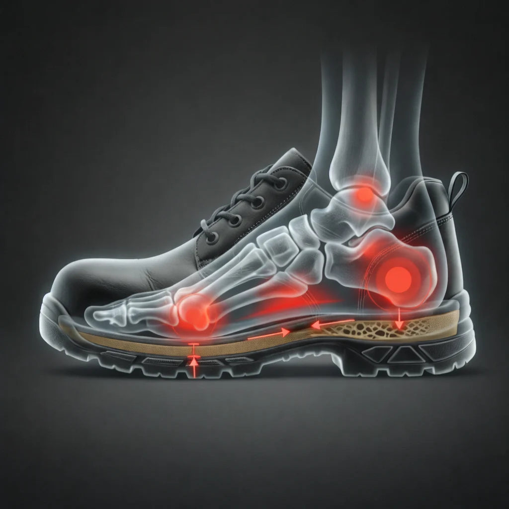Problemet är att vanliga skyddsskor ofta har enkla sulor som snabbt tappar sin stötdämpning. När foten pressas mot en hård sula hamnar belastningen på samma punkter och stöten förs vidare upp genom kroppen – till knän, höfter och rygg.